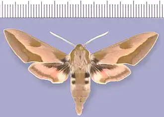 Die Raupen werden 65 bis 70 Millimeter lang. Sie sind anfangs 2,5 Millimeter lang und blass rosa. Kopf, Beine, Thoraxschild und das Analhorn sind schwärzlich braun. Das Analhorn ist kurz und nach oben gerichtet. Am Körper befinden sich Reihen mit ebenso gefärbten Setae. Der Kopf und die Thoraxsegmente haben einen rosafarbenen Stich. Im zweiten Stadium ist die Körpergrundfarbe weiterhin blass rosa und entspricht der Blütenfarbe ihrer Nahrungspflanzen. Eine weißliche dorso-laterale Linie mit Ansätzen von Augenflecken ist ausgebildet. Außerdem kann man eine sehr zarte orange Längslinie auf der Mitte des Rückens erkennen. Im dritten Stadium ist die Färbung ähnlich wie zuvor, die Grundfarbe kann jedoch variieren und auch grünlich oliv sein. Die dorso-laterale Linie ist deutlicher ausgebildet, die Augenflecke sind rein weiß und eine weißlich rosafarbene ventro-laterale Längslinie kommt hinzu. Der Kopf, der Nachschieber und das Analhorn sind schwarz, die Rückenlinie ist blass orange. Im vierten Stadium ist die Grundfarbe grünlich oliv mit verstreuten weißen, häufig dunkel geringten Punkten. Der Kopf, die Beine, das Analhorn und das Thoraxschild sind schwarz. Ausgewachsene Raupen sind ebenso gefärbt, haben aber eine helle, gelbe Rückenlinie. Auf den Seiten des Körpers sind die dorso-lateralen Augenflecken groß, weiß oder gelb und schwarz geringt. Das Analhorn, die Beine und der Nachschieber sind weiterhin schwarz. Die schwarz geringten Stigmen sind gelb.[1]