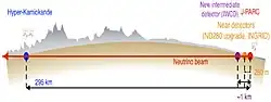 Der Neutrinostrahl für Hyper-Kamiokande wird am Forschungszentrum J-PARC mit einem Protonenbeschleuniger erzeugt und dort von Nahdetektoren vermessen, bevor er zum fast 300 Kilometer entfernten Haupt-Detektor fliegt. Sowohl Neutrinostrahl als auch Nahdetektoren wurden bereits für das T2K-Experiment genutzt. Für Hyper-Kamiokande soll die Energie des Neutrinostrahls auf 1,3 MW erhöht werden.[10]