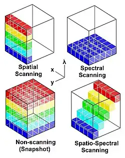 Um den hyperspektralen Datenwürfel mit seinen zwei räumlichen und einer spektralen Dimension zu erhalten, stehen vier grundlegende Techniken zur Verfügung: