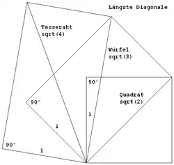 Die längste Diagonale eines Hyperwürfels entspricht der Quadratwurzel seiner Dimension multipliziert mit seiner Kantenlänge.