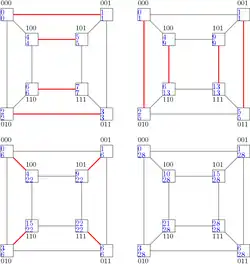 Der -dimensionale Hyperwürfel ist eine Netztopologie für Rechnerbündel mit Rechnern. Sie erlaubt eine effiziente Implementierung der Kommunikations-Grundmuster Broadcast, Gossip, All-Reduce und der Partialsummenbildung.[1] Dazu werden die teilnehmenden Rechner von bis binär durchnummeriert. Jeder Rechner besitzt dann eine direkte Verbindung zu den Rechnern, deren Nummern sich in genau einem Bit von unterscheiden. Diese Struktur wird von den folgenden Algorithmen effizient ausgenutzt.