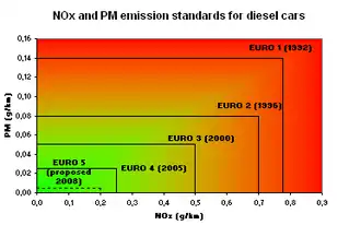 Rußreduzierend wirkt der dieseltypische Magerbetrieb, die Abgasrückführung (→ nächster Absatz) und der geschlossene Dieselpartikelfilter dieser Motoren. Im Gegensatz zu offenen Systemen ist dieser Typ nicht nachrüstbar, da der Motor über eine Sensorik den Füllstand des Filters erkennen und diesen bedarfsweise regenerieren muss. Dafür steigt die Filterleistung von rund 30 auf über 95 Prozent der Partikelmasse, gleiches gilt für die Anzahl der besonders relevanten Nanopartikel (siehe Partikelemission). Der Abbau der Partikel läuft in zwei Stufen. Bei der passiven Regenerierung handelt es sich um eine Oxidierung des Rußfiltrats. Diese funktioniert nur bei Abgastemperaturen, wie sie auf längeren Autobahnfahrten zustande kommen. Hierbei werden mittels im Oxidationskatalysator gebildetem NO2 ab 200 °C Rußpartikel im Filter zu CO2 oxidiert. Das überschüssige Stickstoffdioxid entweicht.[17] Eine aktive Regenerierung muss eingreifen, wenn diese Temperatur nicht erreicht wird und der Filter zu etwa 45 % seines Fassungsvermögens gefüllt ist. Dann stellt die Motorsteuerung eine Temperatur von 600 °C künstlich her, indem sie Diesel direkt nach dem Zündvorgang einspritzt, was zu keiner zusätzlichen Leistung, aber den nötigen Abgastemperaturen führt. Der Verbrauch steigt dadurch um drei bis acht Prozent (je nach Häufigkeit), der Ruß wird hierbei verbrannt. Vom Rußfiltrat bleibt nach der aktiven Regenerierung etwas Asche im Filter übrig, eine Angabe zur Haltbarkeit wurde nicht gemacht. Die Regenerierung benötigt etwa 25 Minuten Zeit ohne Stop & Go-Verkehr bei einer Drehzahl über 2000 min−1 ab dem dritten Gang. Bleiben diese Fahrten aus, blinkt ab 75 % des Filterfüllstandes eine Warnleuchte im Cockpit auf, welche den Fahrer auf eine nötige Regenerierung verweist. Blinkt diese nach der beschriebenen Fahrt weiterhin, ist eine Werkstatt aufzusuchen, welche die Regenerierung durchführt. Unterbleibt auch dies, droht ein Schaden des Partikelfilters, der wie alle geschlossenen namensgemäß über kein Überdruckventil verfügt.[18]