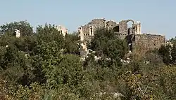 Im östlichen Teil steht eine dreischiffige Basilika von 25 × 30 Metern mit Narthex im Westen. Ihre Apsis geht nach Osten, daneben liegen zwei Pastophorien, die über einen Gurtbogen in zwei Räume geteilt sind und ebenfalls über eine kleine Apsis verfügen. Die Schiffe sind durch von jeweils vier Säulen gestützte Arkaden getrennt. Im Süden schließt sich an die Kirche eine große gedeckte Zisterne an. In ihrer Umgebung liegen nochmals Sarkophage, von denen einer mit Girlanden, Blättern und Tauben geschmückt ist.