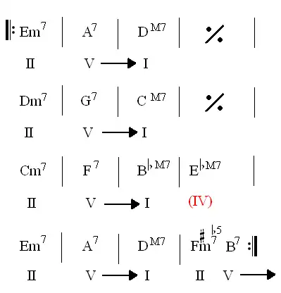 Manche Jazzstandards bestehen fast ausschließlich aus solchen Verbindungen, wie die Changes (M7 bezeichnet dort die große Septime) von „Tune-Up“ (Miles Davis) zeigen:
