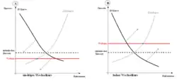 Die Veränderungen der Wechselkurse durch die Zinsen werden von dem Mundell-Fleming-Modell erläutert. Wenn der heimische Zinssatz den Weltzins übersteigt (Abbildung 3A), steigt der Wechselkurs dadurch, dass ausländische Investoren versuchen, Vermögen im Inland anzulegen. Ebenso kann der umgekehrte Fall möglich sein, d. h. der inländische Zinssatz liegt unter dem Weltzins (Abbildung 3B) und inländische Investoren versuchen, im Ausland zu investieren, wodurch der inländische Wechselkurs nach unten korrigiert wird.[18]