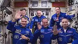 ![]() v. l. n. r.: Jack Fischer, Fjodor Jurtschichin, Peggy Whitson, Paolo Nespoli, Randolph Bresnik und Sergei Rjasanski