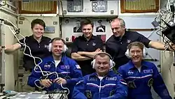 ![]() v. l. n. r.: David Saint-Jacques, Anne McClain, Oleg Kononenko (Kommandant), Alexei Owtschinin, Nick Hague und Christina Hammock Koch | |||