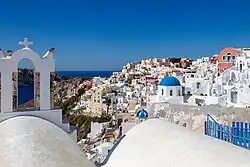 Auffallend sind die oft direkt an den Kraterrand gebauten, für die Kykladen typischen weiß getünchten Häuser. Sie wechseln sich im Stadtbild von Ia mit verwinkelten, engen Gassen, blau gedeckten Kuppelkirchen, blumenumkränzten Verandas und Terrassen, sowie einzelnen neoklassizistischen Kapitänshäusern ab. An der zentralen Kraterrandgasse von Ia sind zahlreiche Hotels, Tavernen, Cafés, Bars sowie Geschäfte mit Kunsthandwerk, Mode und Souvenirs zu finden.