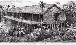 Wie zahlreiche andere indigene Völker Borneos leben die Iban traditionell in Langhäusern. Ein einzelnes Langhaus beherbergt die gesamte Dorfgemeinschaft und enthält sämtliche Wohn-, Arbeits- und Lagerräumlichkeiten. In einem Langhaus können über 50 Familien leben, die Länge des Hauses kann mehrere hundert Meter betragen. Traditionelle Langhäuser aus Holz wurden in Pfahlbauweise am Ufer eines Flusses errichtet. Der schnell wachsende und leicht zu verarbeitende Bambus war ein beliebtes Baumaterial. Er gewährte eine Haltbarkeit von rund 10 Jahren.[6]