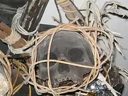 Die Kopfjagd, wie das rituelle Erbeuten und Heimbringen der Schädel getöteter Feinde genannt wird, war eine auf Borneo und im gesamten insularen Südostasien bei vielen Volksgruppen verbreitete Praxis. Die Iban wurden von zeitgenössischen europäischen Beobachtern oft als besonders eifrige Kopfjäger beschrieben, da nach ihrer Ansicht die Kopfjagd häufig Hauptzweck und nicht Nebenprodukt der Piratenraubzüge war. Neben dem allgemeinen Prestigegewinn für einen erfolgreichen Kopfjäger war das Heimbringen frischer Schädel vor allem von religiöser Bedeutung, so waren für die Rituale, die etwa beim Bau eines neuen Langhauses, bei der Heirat des Dorfoberhauptes oder zur Beendigung der Trauerphase nach dem Tod eines Langhausbewohners abgehalten wurden, neue Trophäenschädel erwünscht.[12] Ein weiterer Beweggrund zur Kopfjagd war die Vergeltung, wenn eine Gemeinschaft selbst Opfer der Kopfjagd geworden war. Später gingen die Iban im Zuge ihrer Tätigkeit als Piraten auch ohne konkreten Anlass auf Kopfjagd. Art und Weise der Kopferbeutung war zweitrangig, einen feindlichen Krieger im Zweikampf zu besiegen galt nicht als „ehrenvoller“ als eine Frau oder ein Kind zu töten oder eine Leiche zu enthaupten.[13]