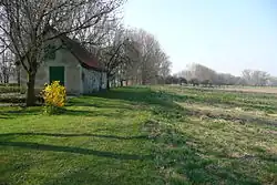 - Der landseitige Damm, der den Gemarkungsteil Busch mit seinem wertvollen Ackerboden schützt, ist höher gelegen und auf einem Grasweg begehbar. Er sollte jedoch als natursensibler Bereich in der Brutzeit und als Unterstand für Rehe gemieden werden. – Die Dammdurchfahrt wird bei Hochwasser geschlossen, indem man starke Bretter zwischen die seitlichen Aussparungen schiebt und den Zwischenraum verfüllt.