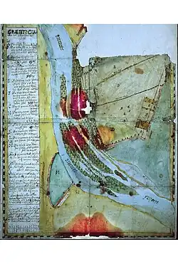 Das nördliche Ende der Insel ist auf historischen Rheinlaufkarten von 1799 und 1842 an der heutigen Gemarkungsgrenze, zwischen Ibersheim und Hamm, bei der Straße zum Rhein (ehemals Gasthaus Schmittel) erkennbar. Die Südspitze war bei der Gemarkungsgrenze zwischen Ibersheim und Rheindürkheim. Dort ist ein Prallhang des Rheines. Bei dem Neubau eines Rheindammes ab 1801, unter napoleonischer Regierung im Departement Donnersberg, ist dort der Einlauf zum Altrhein geschlossen worden. Die wasserbaulich schwierige Maßnahme wurde damals der Familie Brubacher übertragen, die in ihrer Schweizer Heimat, dem Berner Oberland, entsprechende Erfahrungen gesammelt hatten.[4] Mit der Schließung dieses Einlaufs wurde der Altrheinarm (Rheinlöcher/Scheidegraben) zu einem Stillgewässer. Ein Zu- bzw. Abfluss als Niveauregulierung gibt es heute im Norden auf der Gemarkung von Hamm, nahe der ehemaligen Pappelgruppe Zwölf Apostel.