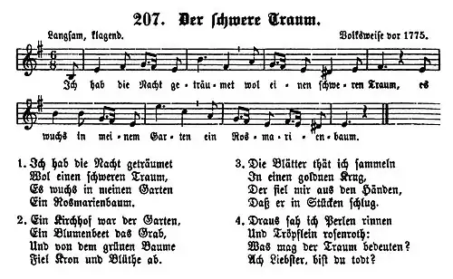 - ↑ Frauke Schmitz-Gropengiesser: Ich hab die Nacht geträumet (2012). In: Populäre und traditionelle Lieder. Historisch-kritisches Liederlexikon zitiert Gustav Zanger (Hrsg.): Deutscher Liederkranz. Op. 8. Heuser's Verlag (Louis Heuser), Berlin und Leipzig 1888, S. 283 (Nr. 124).