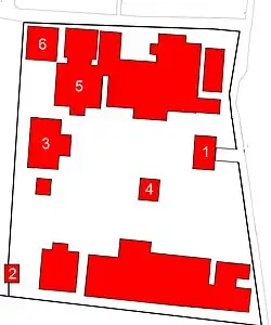 Man betritt die Tempelanlage im Osten durch das Haupttor (山門, Sammon; 1) oder durch das Westtor (西門, Seimon; 2). Vom Haupttor geht es geradewegs auf die Haupthalle (本堂, Hondo; 3) zu. Das jetzige Gebäude, in Kampferholz ausgeführt, stammt aus dem Jahr 1701. Dabei passiert man auf der linken Seiten den Glockenturm (鐘楼, Shoro; 4). Blickt man auf die Haupthalle, so hat man rechts die Daishidō-Halle (大師堂; 5) vor sich. Daneben steht die Goma-Halle (護摩堂; 6), die ein Pyramidendach besitzt.