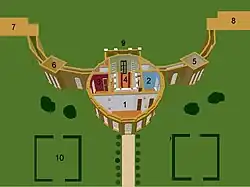 Die Rotunde wird von zwei segmentierten, eingeschossigen, schmalen Flügeln flankiert, die als Blendarkaden erscheinen und sie im palladianischen Stil mit zwei s an den Enden verbinden. Diese segmentierten Flügel werden mittig von vorspringenden Gebäudeteilen unterbrochen, in denen das Rauchzimmer und der Pompeianische Raum untergebracht sind, beide Anbauten aus dem 19. Jahrhundert.