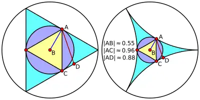 - Die Berührungspunkte des Inkreises mit dem Rand des idealen Dreiecks bilden ein gleichseitiges Dreieck der Seitenlänge mit dem goldenen Schnitt .