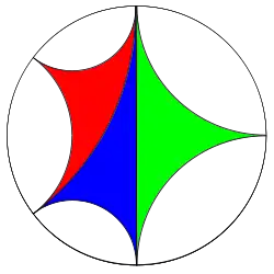 Im Kreisscheibenmodell der hyperbolischen Ebene wird ein hyperbolisches Dreieck von drei Kreisen berandet, die den Kreis im Unendlichen in drei rechten Winkeln schneiden.