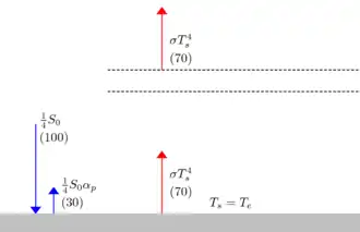 Die Flussdichte einfallender Solarstrahlung wird durch die Solarkonstante S0 spezifiziert. Da die Oberfläche des idealisierten Planeten als Kugel das Vierfache ihres Querschnitts (auch: Schattens) ist, ist die oberflächenbezogen einfallende Strahlung S0/4. Die planetare Albedo αP ist der Teil einfallender Solarstrahlung, der zurück ins All reflektiert wird. Dabei ist es gleichgültig, zu welchen Teilen die Reflexion an der Planetenoberfläche oder an der Oberseite der Atmosphäre zustande kommt.