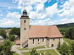 - Die Sandsteinfigur des böhmischen Landesheiligen Johannes Nepomuk vor der Kirche entstand 1740–1747.