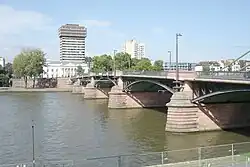 Sie entstand 1876 bis 1878 nach einem Entwurf von Peter Schmick als fünfte Mainbrücke in Frankfurt. Abgesehen von einem schmalen Steinbogen am nördlichen Ufer, durch den die Verbindungsbahn führt, bestanden die anderen fünf Brückenbögen aus einer schmiedeeisernen Fachwerkkonstruktion. Die fünf Brückenpfeiler waren aus Rotem Mainsandstein gemauert, ihre Fundamente aus Beton gegossen. Die Spannweite der äußeren Bögen beträgt 33,25 Meter, die der benachbarten Bögen 38,50 Meter, während der mittlere Bogen 40,25 Meter breit ist.