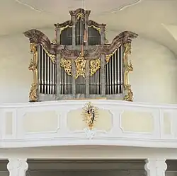 II/P | 15 | Kegellade, pneumatische Traktur. Im Rokokoprospekt der Vorgängerorgel von Johann Peter Plersch (1765). 1950 umgebaut und um ein Register erweitert → Orgel | |