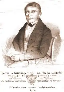 - ↑ Constantin von Wurzbach: Kürsinger, Ignaz von. In: Biographisches Lexikon des Kaiserthums Oesterreich. 13. Theil. Kaiserlich-königliche Hof- und Staatsdruckerei, Wien 1865, S. 332–334 (Digitalisat).