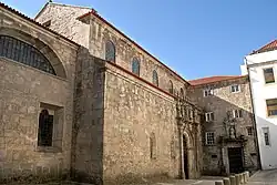 Der einschiffige Baukörper wird durch einen Chor abgeschlossen. Wie es bei der Kirche eines Frauenklosters üblich war, befand sich der Haupteingang an der nördlichen Seitenfassade. Dieses Portal, mit einem Rundbogen, wird flankiert von Pilastern und weist einen von Gebälk unterstützten Fries mit drei Nischen auf, deren Abschluss mit Zinnen versehen ist. Es vereint Tado-Gotik und Renaissance-Elemente, die im 18. Jahrhundert hinzugefügt wurden.