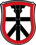 Blasonierung: „Im silbernen Schild mit rotem Schildbord das schwarze Balkenbild des sogenannten 'Wilden Mannes'.“[30]