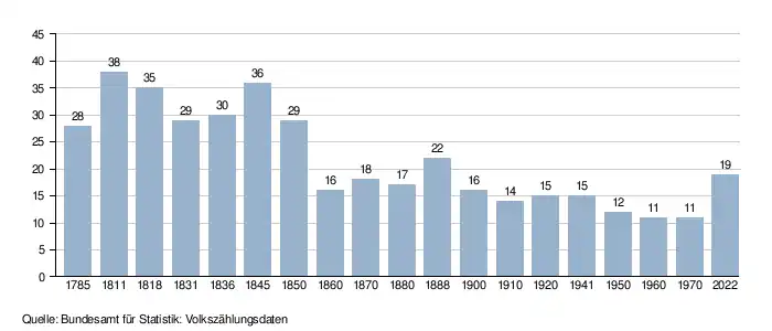 - ↑ Daten der Eidgenössischen Volkszählungen ab 1850 nach Gemeinden. (XLSX; 10 MB) Bundesamt für Statistik, Neuchâtel, 12. Juli 2024, abgerufen am 15. Mai 2025 (Öffnung in Excel nur über "Anhang/Excel-Datensatz" möglich).