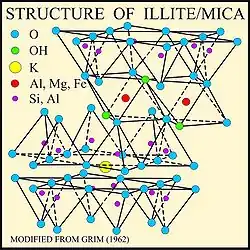 Illit ist die Bezeichnung für eine Serie von Tonmineralen. Der Name stammt von dem US-amerikanischen Bundesstaat Illinois, wo Illit erstmals beschrieben wurde.[1] Es sind dreischichtige Schichtsilikate, bestehend aus einer Aluminium (Al)-Oktaeder-Schicht und zwei umgebende Silikat (Si)-Tetraederschichten. Sie sind den Glimmern strukturell sehr ähnlich und entstehen auch aus diesen, sowie anderen Silikaten (Feldspat, Foide und anderen).