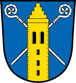 Blasonierung: „In Blau zwei schräg gekreuzte silberne Krummstäbe, an der Kreuzung überdeckt von einem wachsenden goldenen Kirchturm mit Treppengiebel.“[9] |
