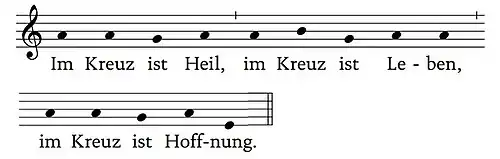 Der Ruf ist im Gotteslob dreimal enthalten (Nr. 296, 563.1, 569.1). Er wird als Antiphon besonders im Rahmen der Osterliturgie am Karfreitag wie auch zum Fest der Kreuzerhöhung gesungen.[3][4] Die Singweise ist dieselbe wie für den Ruf „Christus gestern, Christus heute, Christus in Ewigkeit“ (Gotteslob 644.1). Als Melodiequelle werden dort die Laudes Hincmari (8./9. Jahrhundert) angegeben.