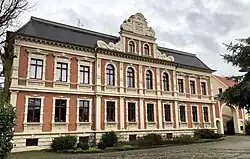 Der stattliche zweigeschossige Bau entstand im Jahr 1894 als massives Ziegelgebäude und gilt als sehr gut erhaltenes Beispiel für einen sogenannten Rübenpalast, mit dem Großbauern in der Gründerzeit ihren Wohlstand ausdrückten. Er verfügt über ein Souterrain. Die Fassade ist zehnachsig, wobei die vier mittleren Achsen als flacher Mittelrisalit gestaltet sind. Die vier oberen Fenster des Risalits sind als Rundbogenfenster ausgeführt. Der Risalit wird von einem prächtig gestalteten Schweifgiebel bekrönt. Die Gliederung der Fassade erfolgt mittels Putzelementen. Sie ist üppig verziert, so bestehen Stuckverzierungen im Stil des Neobarocks und Pilaster. Bedeckt wird das Haus von einem Walmdach. Rechts des Wohnhauses schließt sich ein Torbogen an.