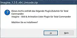 Der Programmierer bietet zudem eine ZIP-Version des Imagine Viewer als Lister-Plugin für den Dateimanager Total Commander an. Bei Aufruf der ZIP-Datei wird nach einer Abfrage das Plugin installiert. Mit Strg+Q wird nun im zweiten Fenster das Bild – auf dem der Cursor im ersten Fenster steht – dargestellt. Dort können die üblichen Viewerfunktionen wie Vergrößern, Verkleinern, Spiegeln usw. durchgeführt werden.