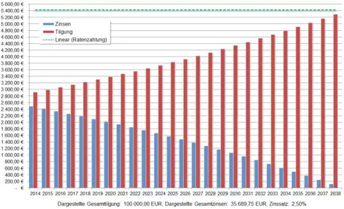 Die Darlehen für eine private Immobilienfinanzierung sind über einen festgelegten Zeitraum zu tilgen. Das Annuitätendarlehen stellt eine der häufigsten Darlehensformen dar. Bei einem Annuitätendarlehen fließt die Tilgung direkt in das Darlehen und reduziert im Finanzierungsverlauf die Zinsbelastung. Typischerweise wird ein Annuitätendarlehen nicht über den gesamten Zeitraum abgeschlossen, der nötig ist, um das Darlehen vollständig zu tilgen („Volltilgerdarlehen“). Stattdessen sind in Deutschland Zinsbindungsfristen von 5, 10 oder 15 Jahren üblich. Je kürzer diese Frist, desto niedriger ist in der Regel der Zinssatz. Kurze Laufzeiten weisen aber höhere Risiken bei einem Anstieg des Zinsniveaus auf, die später die monatliche Belastung („Rate“) stark erhöhen können.[10]