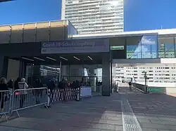 Impfzentren wurden unter anderem in Messehallen, Stadien und Stadthallen eingerichtet.[19][20] In den Impfzentren werden Impfärzte, die sich aus niedergelassenen Ärzten und Ärzten im Ruhestand rekrutieren,[21] und Pflegepersonal beschäftigt.[22] Für die Terminvergabe musste man sich registrieren und sie erfolgte zunächst nach den Vorgaben der Priorisierungsgruppen, die nach Alter, Berufsgruppe und Risikogruppen zusammengestellt worden waren. Erst später wurden Termine auch an nicht priorisierte Personen vergeben.[23][24] Mit weiterem Fortschritt der Impfkampagne wurden auch unangemeldete Impfungen in den Impfzentren ermöglicht.[25]