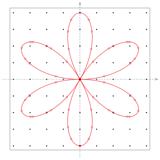 Beispiel: Das Bild zeigt ein (zur Demonstration grobes) Raster mit den zugehörigen berechneten Kurvenpunkten für die implizite Kurve mit der Gleichung: