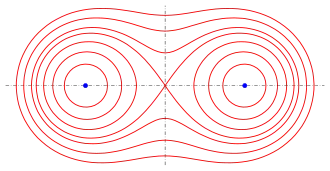 Die Äquipotentiallinien zweier gleicher Punktladungen in den Punkten lassen sich implizit durch