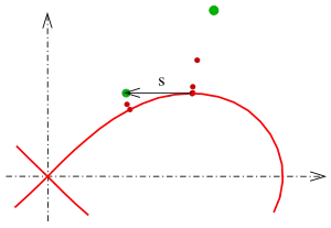 - (V3) berechnet die Tangente (s. oben), wählt auf der Tangente mit der Schrittweite einen weiteren Startpunkt und berechnet mit den zweiten Kurvenpunkt .