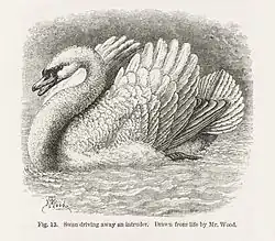 - „Sobald der Höckerschwan einen Gegner vertreiben, sich also ein Furcht erregendes Äußere geben will, hebt er die Ellenbogen nebst den Armschwingen und legt schließlich auch den Hals mehr oder weniger zurück. Sieht der Vogel die Überlegenheit des Gegners ein, und gerät er in Furcht, so hört das Flügelstellen auf und macht der gewöhnlichen Körperhaltung Platz. Es ist klar, daß hauptsächlich der geschlechtsreife männliche Vogel, und zwar namentlich vor, während und kurz nach der Brutzeit, diese Imponierstellung einnimmt.“[4]