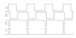 Diese Rechteckspannung wird auf einem Weg direkt (Signal A) zu einem NAND-Gatter geführt und auf einem anderen Weg verzögert und invertiert (Signal B) zum anderen Eingang des NAND-Gatters. Ohne Verzögerung würde die Ausgangsspannung des invertierenden NAND-Gatters stets +5 V betragen. Wegen der kurzen Verzögerung durch das RC-Glied und der Laufzeit des invertierenden Und-Gatters treten jedoch sehr kurze Zeiten von einigen Nanosekunden auf, während derer das Signal A schon auf +5 V ist und das Signal B noch nicht 0 V erreicht hat. Während dieser Zeit beträgt die Ausgangsspannung X kurzzeitig 0 V. Falls umgekehrte Polarität gewünscht wird, kann ein weiterer Inverter verwendet werden, um den Signalverlauf X umzukehren. Die Spannung Y ist dann fast ständig auf 0 V und springt kurzzeitig auf +5 V.