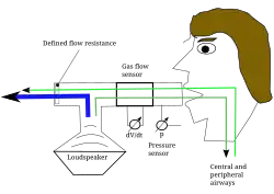 Ein Messaufnehmer, der Druck und Fluss gleichzeitig erfassen kann, befindet sich in der Nähe des Patienten. Dieser atmet über ein Mundstück durch den Messaufnehmer, an dessen Ende sich ein Lautsprecher sowie ein definierter Abschlusswiderstand befinden. Bereits technisch realisierte Messapparaturen verwenden meist einen Lautsprecher als Impulsgenerator. Der Patient atmet durch den Messaufnehmer und einen Metallsieb als definierten Abschlusswiderstand.