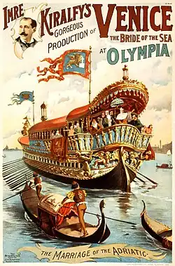 Anschließend zog Imre Kiralfy nach England, wo er Direktor der London Exhibitions Limited wurde und weitere Großspektakel auf die Beine stellte. So organisierte er eine permanente Ausstellung in Shepherd’s Bush und baute ein Mini-Venedig im Olympia, um zu demonstrieren, was Maschinenkraft, Wasser und Strom bewerkstelligen können.[2] Das Veranstaltungsgelände Earls Court Exhibition Ground wurde modernisiert und es folgten jährlich Ausstellungen wie Empire of India, India and Ceylon, The Victorian Era, The Universal Exhibition, Greater Britain, Woman’s, International, The Military Exhibition, Paris in London und die Imperial Austrian Exhibition.[1]