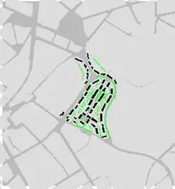 Die Straßen sind von Reihenhausgruppen gesäumt.