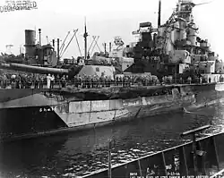 Die Indiana nach der Kollision mit der USS Washington. Erste Behelfsreparaturen an der Schadstelle sind deutlich zu erkennen.