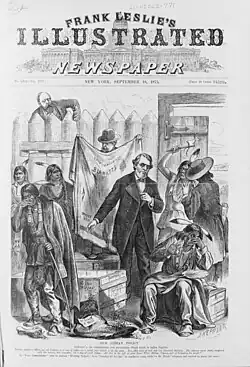 Titelblatt von Frank Leslie’s Illustrated Newspaper vom 18. September 1873. Es karikiert Friedensunterhändler, die den sich abwendenden Indianern „belüftete“ Decken, leere Gewehrkisten und stinkendes Fleisch anbieten.
