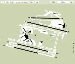 Der Flughafen gehört zu den verkehrsreichsten in Asien und verfügt über vier Start-/Landebahnen sowie drei Terminals: Terminal 1 ist der ehemalige Palam International Airport, das für den nationalen Flugverkehr verwendet wird. Terminal 2 und vor allem Terminal 3 sind für internationale Flüge vorgesehen.