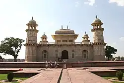 Wegbereiter des mogulischen Grabmalstils war das Mausoleum des Mogulkaisers Humayun in Delhi, das 1571 als erstes monumentales Grabmal und als erster Monumentalbau der Mogulzeit überhaupt fertiggestellt wurde. Es besteht aus einem achteckigen, überkuppelten Mittelraum, dem vier in die Himmelsrichtungen weisende Pishtaqs mit je zwei Chattris vorgelagert sind. Die Kuppel ist als erste auf dem indischen Subkontinent doppelschalig ausgeführt, d. h., es wurden zwei Kuppeldächer übereinander gesetzt, so dass die innere Raumdecke nicht mit der Wölbung der Außenkuppel übereinstimmt. Spätere Baumeister machten sich diese Bauform zunutze, um die äußere Scheinkuppel immer stärker zwiebelförmig auszuwölben.[18] Vier identische, achteckige Eckbauten mit je einem großen chattri auf dem Dach füllen die Nischen zwischen den Pishtaqs, sodass der gesamte Baukörper äußerlich als Quadratbau mit abgeschrägten Ecken und eingerückten Pishtaqs erscheint. Das eigentliche Mausoleum erhebt sich auf einem stockwerkhohen, terrassenartigen Sockel, in dessen Außenwände zahlreiche iwane eingelassen wurden. Humayuns Grabmal vereint aus der einheimischen Bautradition übernommene und persische Elemente in sich, wobei letztere deutlich überwiegen, da nicht nur der Architekt aus Persien stammte, sondern im Gegensatz zu vielen früheren Bauvorhaben auch ein großer Teil der beim Bau eingesetzten Handwerker ausländischer Herkunft war.[19] So sind indische Architrave, Konsolen und plastische Verzierungen vollständig zu Gunsten von Kielbögen und flächigem Fassadenschmuck zurückgedrängt. Die persische Vorliebe für symmetrische Formen spiegelt sich sowohl im Grabmal als auch in der dieses umgebenden, ummauerten Gartenanlage wider. Letztere entspricht dem Typus des Char Bagh mit quadratischem Grundriss und vier Fußwegen, die ein Achsenkreuz bilden und den Garten somit in vier kleinere Quadrate unterteilen.