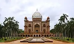 Auch in Delhi setzte sich der achteckige Grundriss in der zweiten Hälfte des 14. Jahrhunderts durch, wie am Grab des Ministers Khan-i-Jahan aus der Zeit Firuz Shahs zu sehen ist. Dies ist möglicherweise so, weil das dem Kreis angenäherte Achteck als Grundlage des Unterbaus bessere statische Eigenschaften beim Bau einer Kuppel mit sich bringt als das Quadrat, welches kompliziertere Trompenlösungen erfordert.[17] Unter der Sayyid-Dynastie etablierte sich in der ersten Hälfte des 15. Jahrhunderts ein Typus, der neben dem achteckigen Grundriss durch eine bisweilen mittels eines Tambours erhöhte Kuppel sowie durch einen umstehenden Arkadengang mit Konsoldach gekennzeichnet ist. Diesen Typus vertritt das Mausoleum Muhammad Shahs in Delhi, dessen Kuppelabschluss in der Form eines Lotos und Zierpavillons (Chattris) auf dem Arkadendach bereits einige Merkmale späterer mogulischer Moscheen und Grabmäler vorwegnimmt. Ihm folgen in der ersten Hälfte des 16. Jahrhunderts die sehr ähnlichen Gräber Isa Khans in Delhi und Sher Shahs in Sasaram (Bihar, Nordostindien) nach.