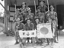 Australische Soldaten mit erbeuteter japanischer Flagge, Tarakan auf Borneo, Juli 1945